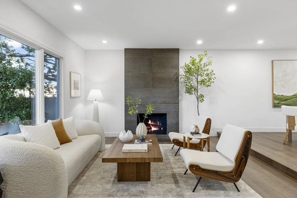 Entertaining Core: Formal dining plus a dramatic sunken living room with sleek tile-clad fireplace.