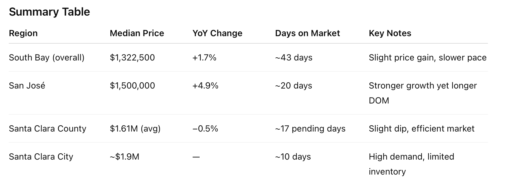 RegionMedian PriceYoY ChangeDays on MarketKey NotesSouth Bay (overall)$1,322,500+1.7%~43 daysSlight price gain, slower paceSan José$1,500,000+4.9%~20 daysStronger growth yet longer DOMSanta Clara County$1.61M (avg)−0.5%~17 pending daysSlight dip, efficient marketSanta Clara City~$1.9M—~10 daysHigh demand, limited inventory